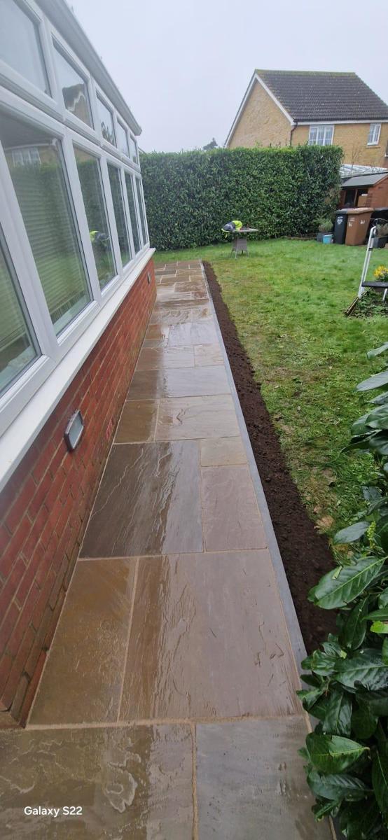 The aim here was to create a large, practical patio area with a clean pathway running alongside the house.